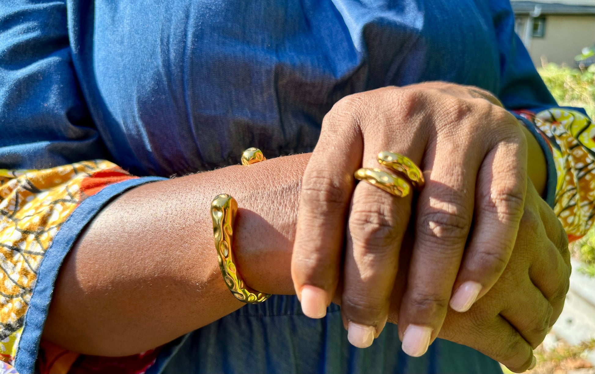 The Aurora Wrap Ring blends fluid design with striking elegance. Its sculptural wrap shape makes it a standout accessory, while the gold-plated stainless steel ensures long-lasting shine without tarnishing. A perfect statement piece that’s both modern and timeless.